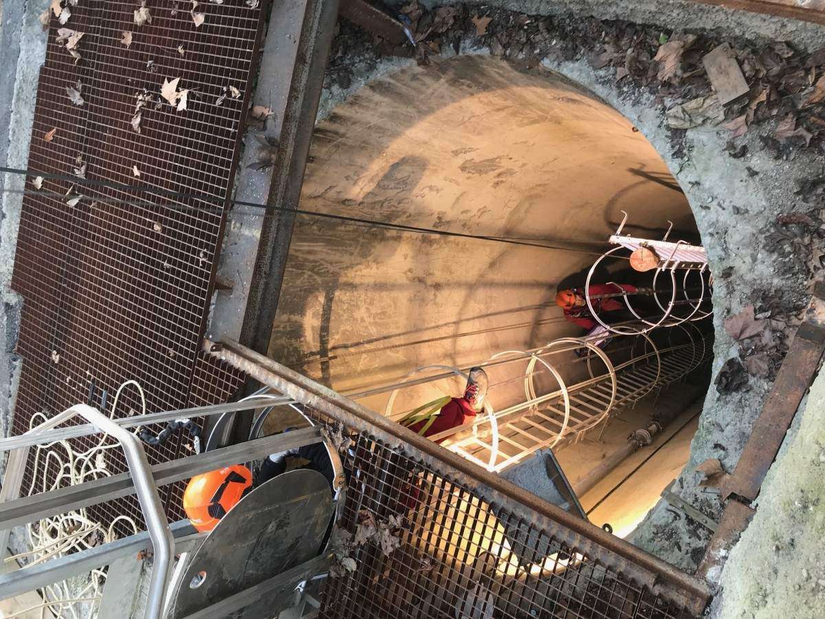 En effet, nos spécialistes ont installé une échelle à crinoline de 25 m dans un puit permettant de relier d’anciennes galeries romaines, les fameuses arêtes de poisson, en plein centre-ville de Lyon.