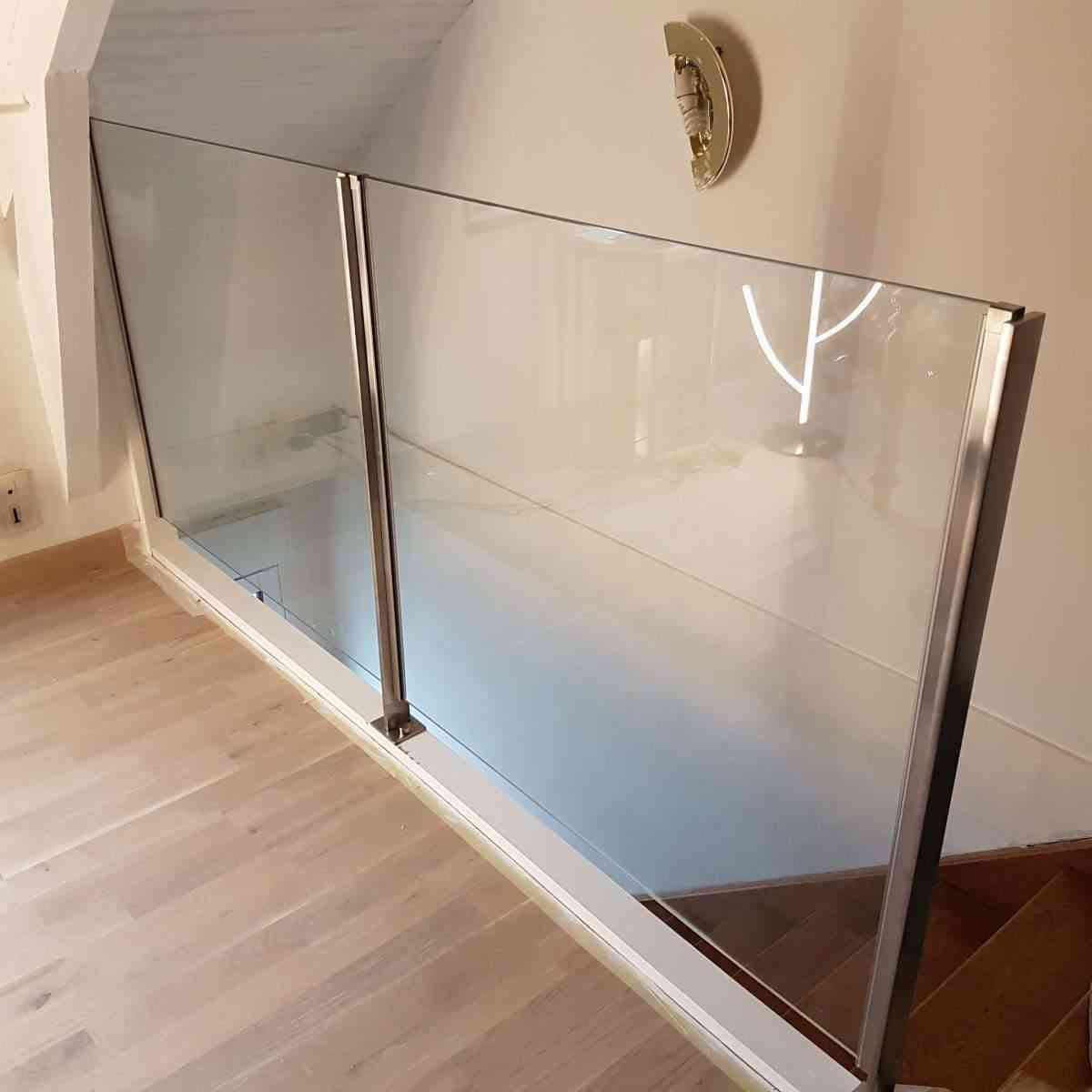 Voici les photos avant/après de l’installation d’un garde-corps d’étage avec des poteaux sur-mesure en inox et panneaux de remplissage en verre feuilleté
