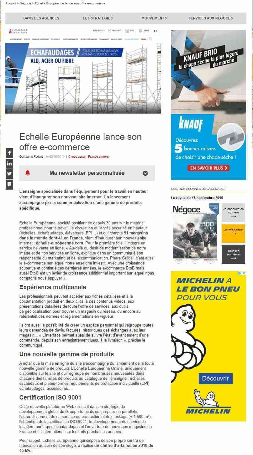 LE MONITEUR - 3 Octobre 2019 - L'Echelle Européenne lance son offre e-commerce