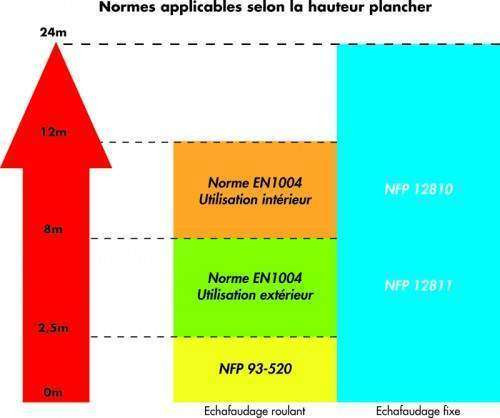 Par obligation, la norme impose que chaque échafaudage pré-fabriqué soit désigné par sa classe de charge, sa hauteur maximale en intérieur et sa hauteur maximale en extérieur. La largeur du plancher ne doit pas être inférieure à 60 cm et 100 cm pour la longueur. Les constituants des planchers doivent être durables et avoir une surface antidérapante. La hauteur entre planchers doit être de 2,25 m