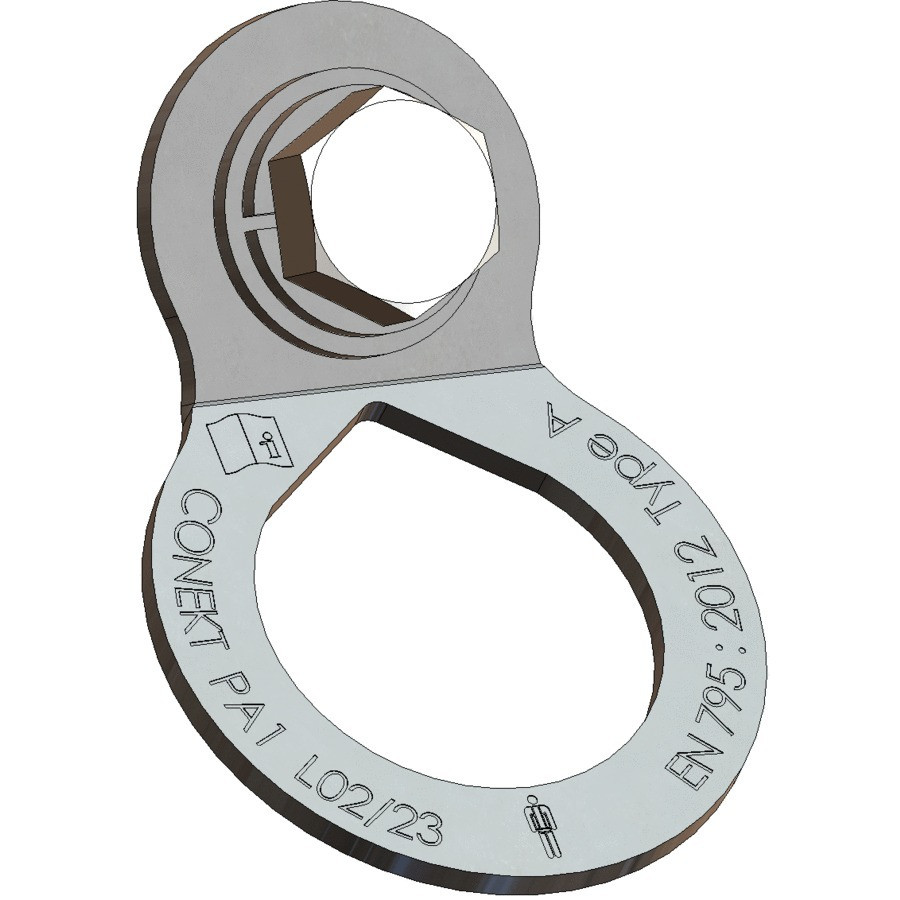 Plaquette d'ancrage avec entretoise permettant une libre rotation. Grace à son ouverture de 40mm, cet ancrage peut être utilisé avec tout type de mousqueton, y compris les mousquetons grande ouverture.