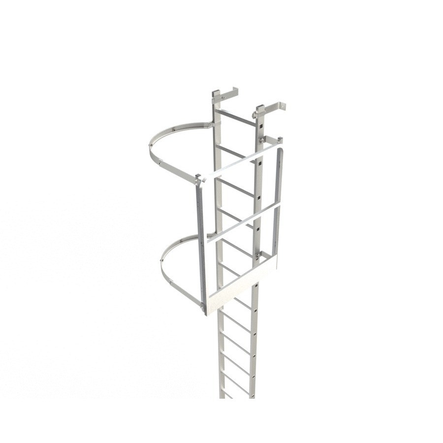 Découvrez notre échelle à crinoline, conçue entièrement en aluminium, permettant d'atteindre une hauteur de 5000 mm. Sortie haute munie d'une passerelle de franchissement d'acrotère. Configuration équipée d'une sortie latérale intermédiaire avec plate-forme.
