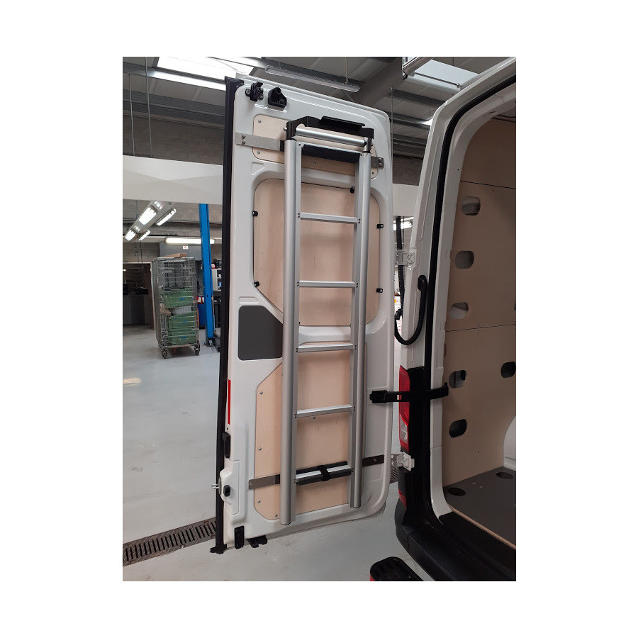 Côté rangement, cette échelle télescopique a été conçue pour pouvoir être rangée sur une porte arrière, du côté intérieur de la camionnette, grâce à des crochets de suspension.