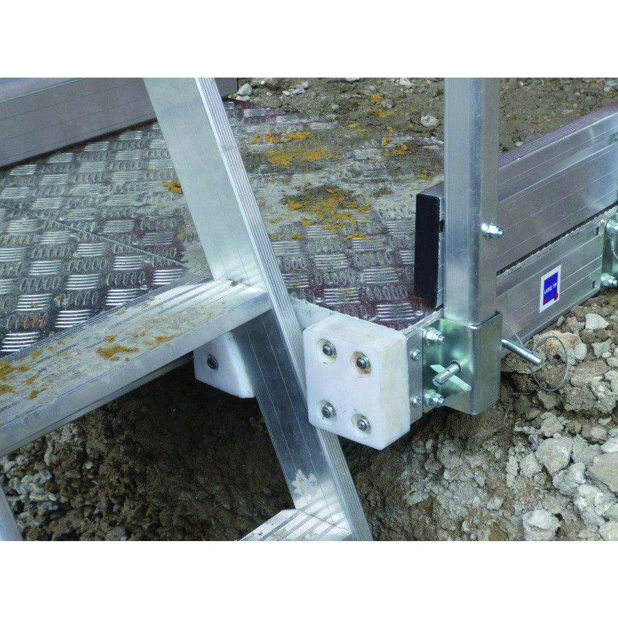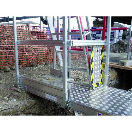 Zone d'accès à la tranchée entièrement sécurisée collectivement par des garde-corps et un portillon coulissant. Plate-forme robuste avec revêtement Leevelgrip.