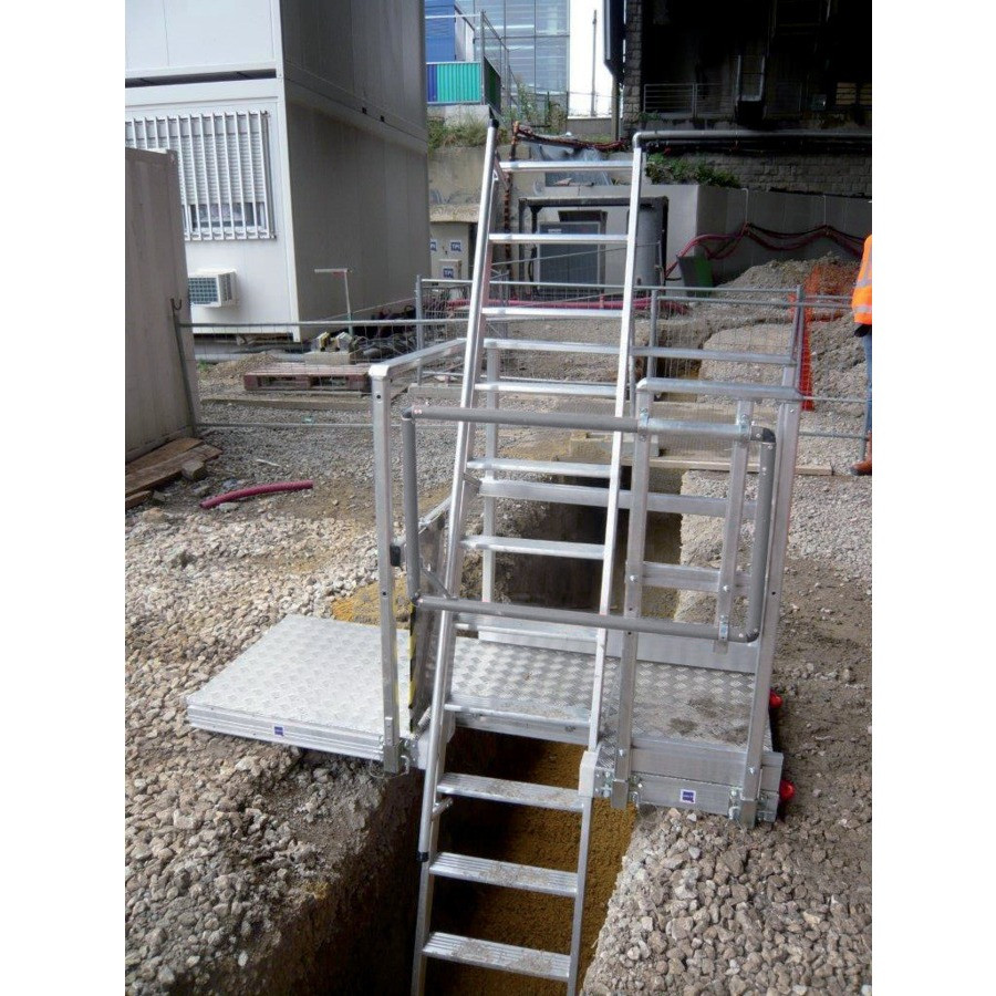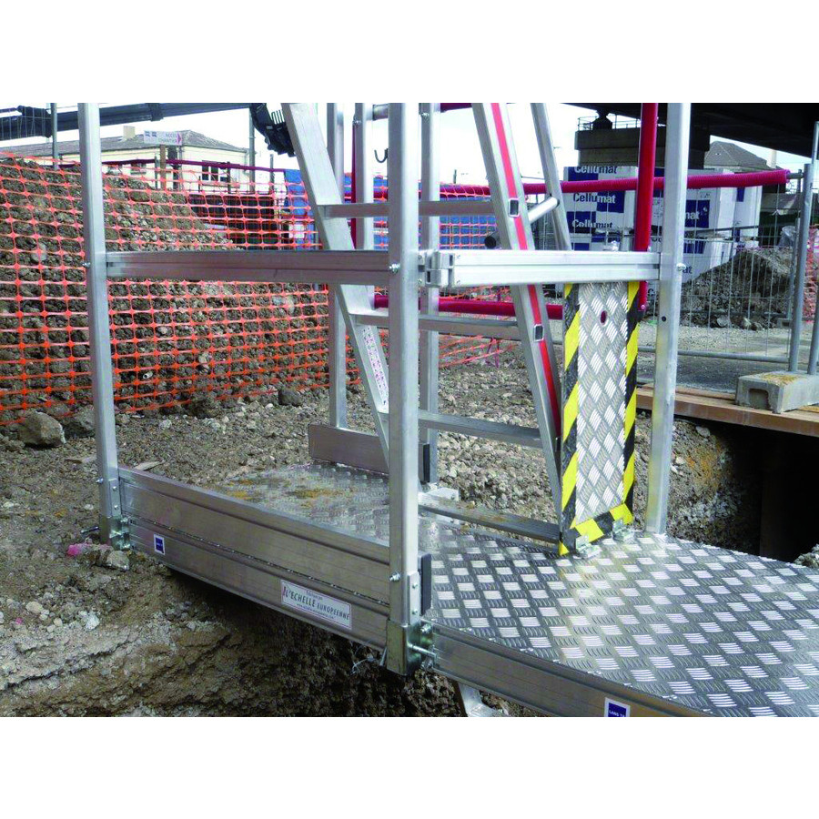 Plate-forme sécurisée conçue pour accéder aux tranchées avec ou sans blindage en milieu urbain, ou extérieur sur tous les chantiers d'assainissement ou d'enfouissement de réseaux. Utilisable avec 3 longueurs d'échelles à marches permettant d'accéder à des profondeurs de tranchées jusqu'à 5,50 m.