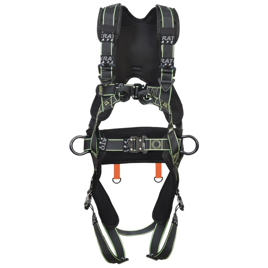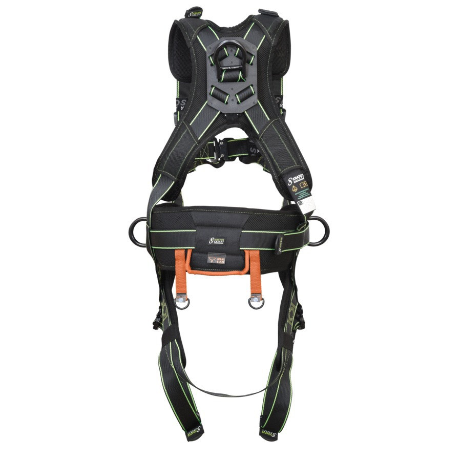 Points d'accrochage : 1 Dé dorsal, 1 accrochage sternal formé de 2 boucles textile pour système antichute et 2 Dés latéraux au niveau de la taille pour le positionnement au travail.