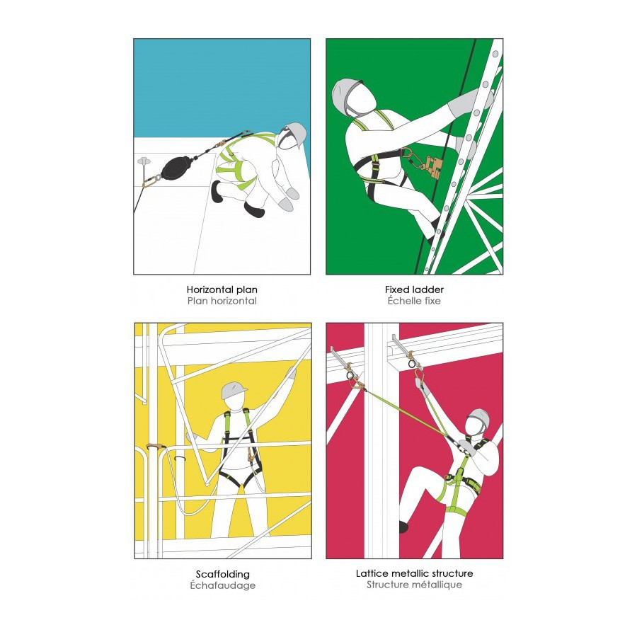Conçu en sangle de largeur 45 mm pour limiter l'impact en cas de chute à moins de 6 kN. Protégé par une pochette zippée.