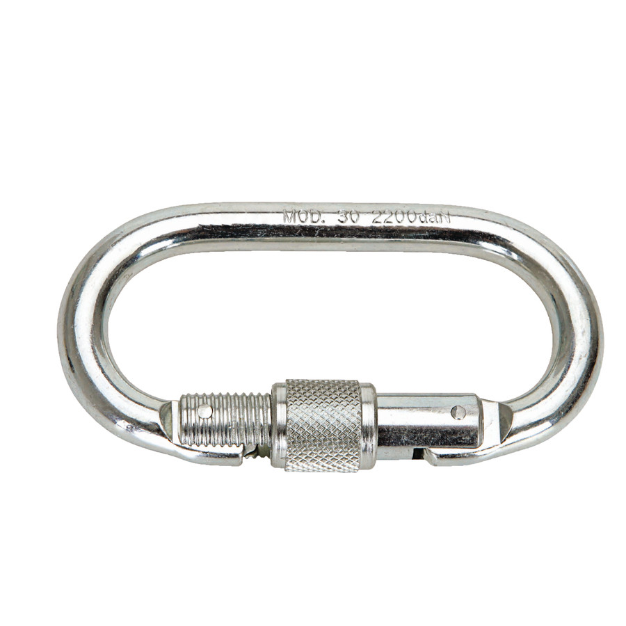 Le mousqueton est un connecteur avec une fermeture à ressort et une bague à verrouillage manuel. Ce système de fermeture évite les ouvertures involontaires ou accidentelles du mousqueton. Tous les composants du mousqueton (Corps, broches, ressort et bague de verrouillage à vis) sont en acier, avec d'excellentes propriétés mécaniques.