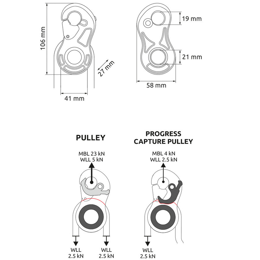 La conception innovante des flaques et du système d'ouverture est conçue pour faciliter l'utilisation d'une seule main : elle permet l'installation de la corde même lorsque la poulie est connectée à l'ancrage et garantit une sécurité maximale, évitant toute possibilité d'ouverture sous charge.