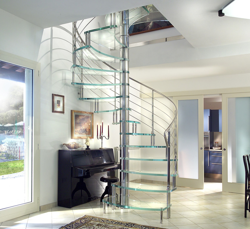 Escalier haut de gamme en colimaçon avec marches en verre pour un intérieur contemporain.