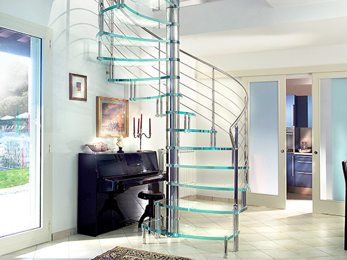Escalier haut de gamme en colimaçon avec marches en verre pour un intérieur contemporain.Le ROSACE allie la lumière du verre et la modernité de l'inox.Finition irréprochable de toutes les pièces compo...