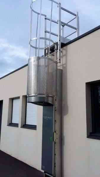 Le magasin L'Echelle Européenne de Caen a réalisé la pose de cette échelle à crinoline en aluminium avec porte de condamnation pour le collège de Villers-Bocage dans le département du Calvados (14).
