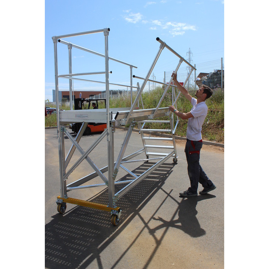 Optez pour nos quais mobiles EN-14122-2/3 pour la sécurité et leur polyvalence. Garde-corps rabattables, roues alu, plateau perforé, longueurs 5m, inclinaison 60°.