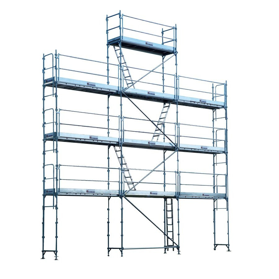 Cet échafaudage fixe se compose de 3 éléments de base très faciles à manipuler s'assemblant sans outils : un cadre en H symétrique, garde-corps intégrant la plinthe, plancher aluminium, bois ou 1/2 plancher acier.