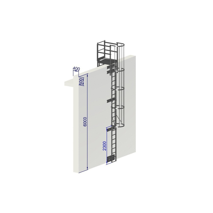 | Échelle à crinoline hauteur 6000 mm avec passage d'acrotère et fixation bardage NF E85-016 | |