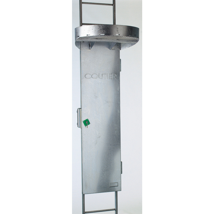 Porte de condamnation avec opercule conçue pour tout type d'échelle normalisée à crinoline, fixée en partie basse, empêchant la montée à toute personne non autorisée et/ou non habilitée.