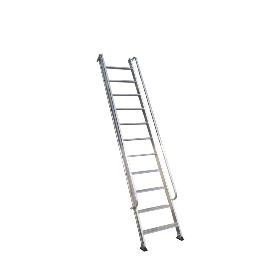 Marches de 80 mm de profondeur, en aluminium striéHauteur entre les marches de 250 mmMains-courantes des 2 côtésInclinaison de montée 70°Largeur extérieure aux montants de l'échelle : 500 mmLargeur ex...