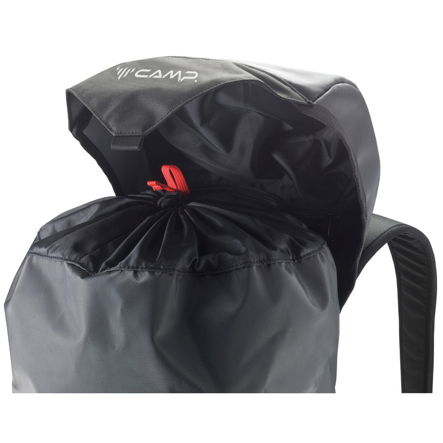 Capuchon avec poche intérieure. Fermeture externe avec boucle crochet et interne avec bloqueur de cordon. Brettelles rembourrées. Porte-étiquette transparente. Boucles internes pour la corde. Poignée de levage garantie pour des charges jusqu'à 50 kg.