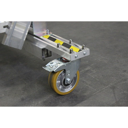 Passerelle dotée de stabilisateurs roulants lestés pour une mise en place et un déplacement faciles.