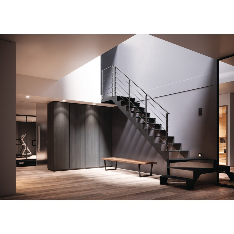 Découvrez notre escalier droit et 1/4 tournant GEMMA à double limons à la fois droit en partie basse et à crémaillère en partie basse, en metal, très moderne !