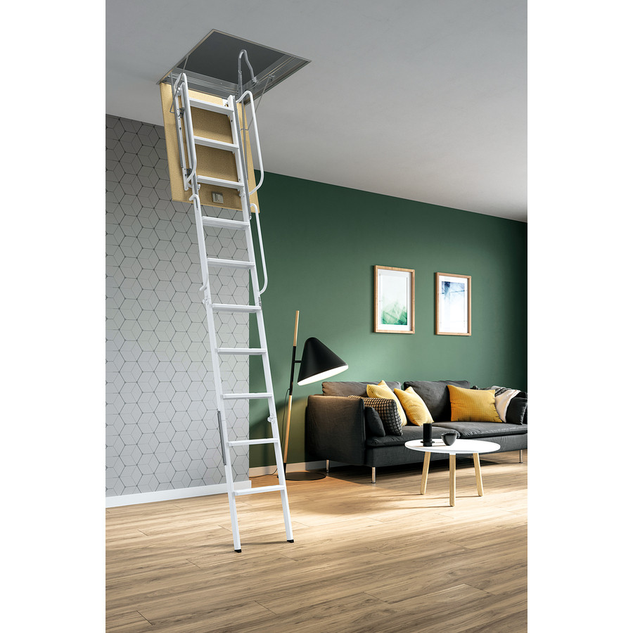 L'escalier escamotable 4PZ droit se compose d'une structure rigide à 4 éléments mobiles composé de 10 marches en acier vernis blanc (RAL 9010) et d'un caisson galvanisé.