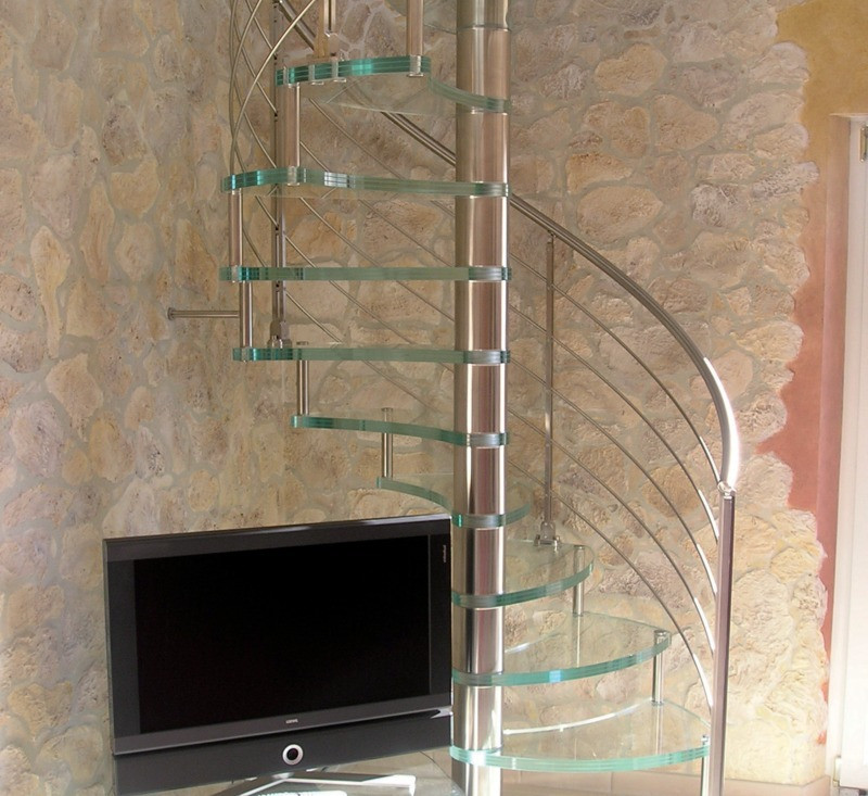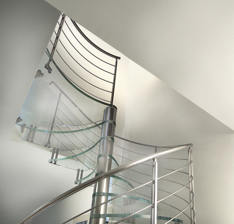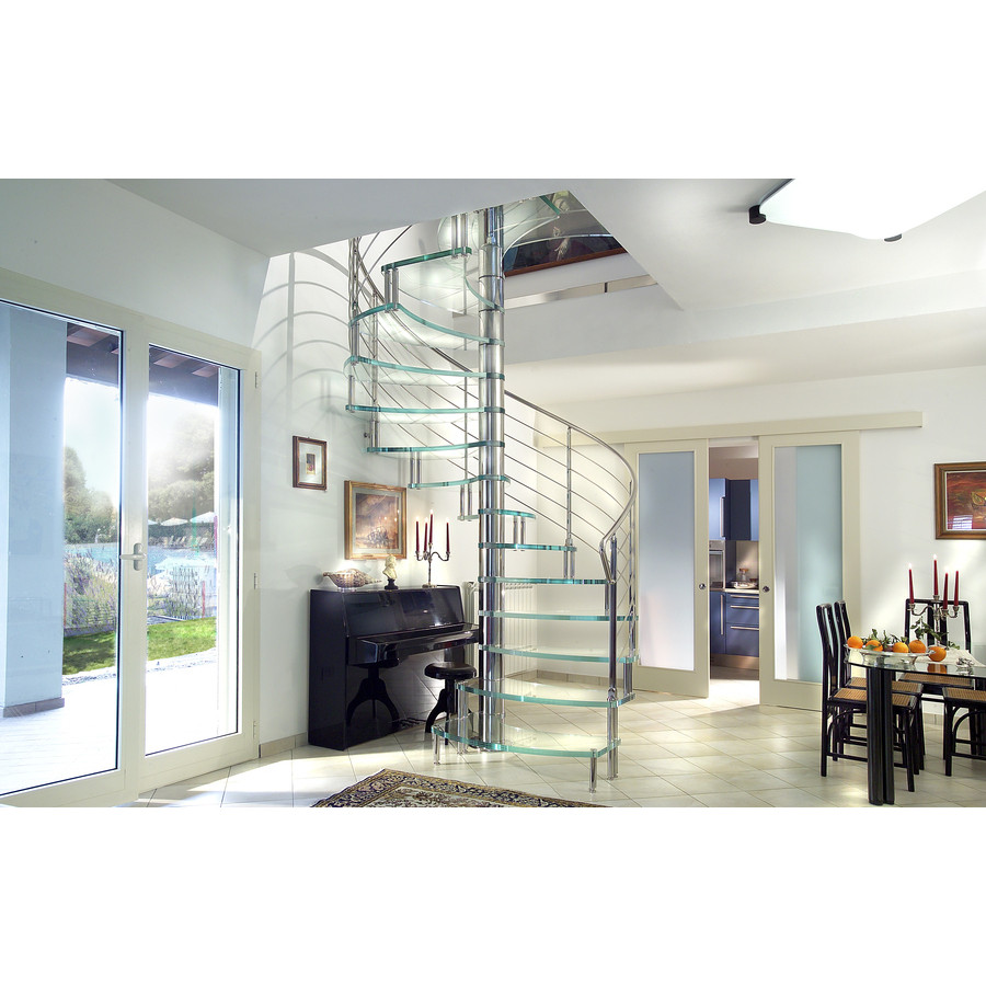 Escalier haut de gamme en colimaçon avec marches en verre pour un intérieur contemporain.