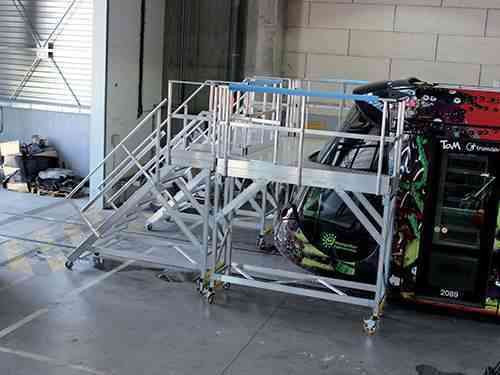 Passerelles pour maintenance de bus, plates-formes de travail télescopiques, marchepieds spéciaux pour nettoyage de tramway, plates-formes roulantes pour bachage de remorques ... nous répondons à toutes les demandes d'equipements de travail en hauteur.
