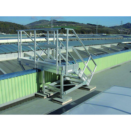 Passerelle de circulation en aluminium entre deux toitures.Système de fixation autoportant empêchant la fixation sur la toiture.Reprise de la passerelle sur la façade.