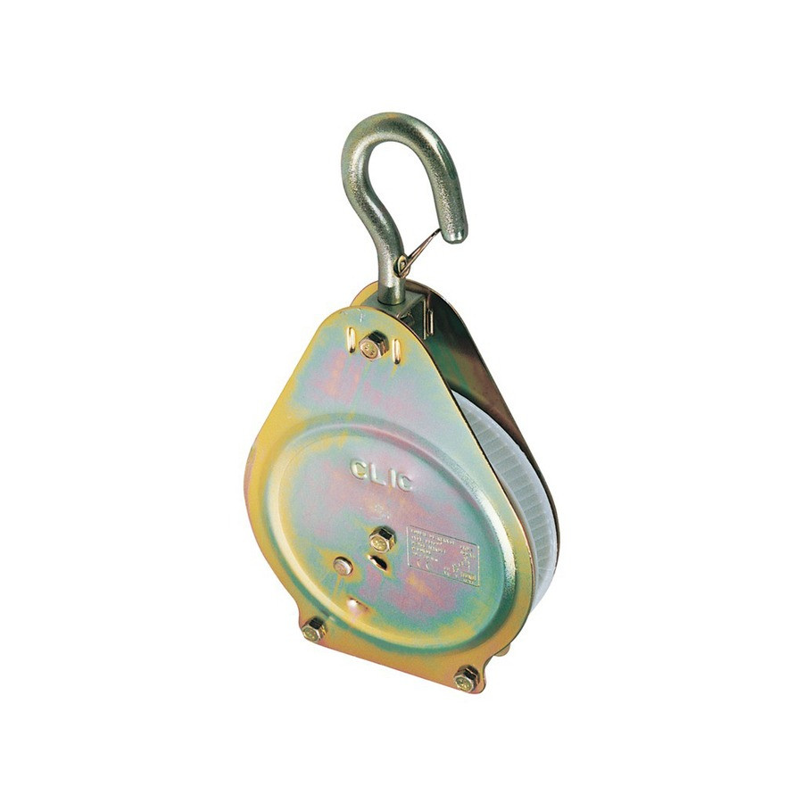 La poulie CLIC permet le levage de tous types de matériaux de construction, éléments d'échafaudage, etc. Son système d'encliquetage offre la possibilité de faire une pause au cours du levage de la charge. Si la tension sur la corde s'arrête, un cliquet bloque le réa et la gorge trapézoïdale freine le glissement de la corde. Une nouvelle traction débloque le cliquet, assurant confort et sécurité par rapport à une poulie de renvoi ordinaire.