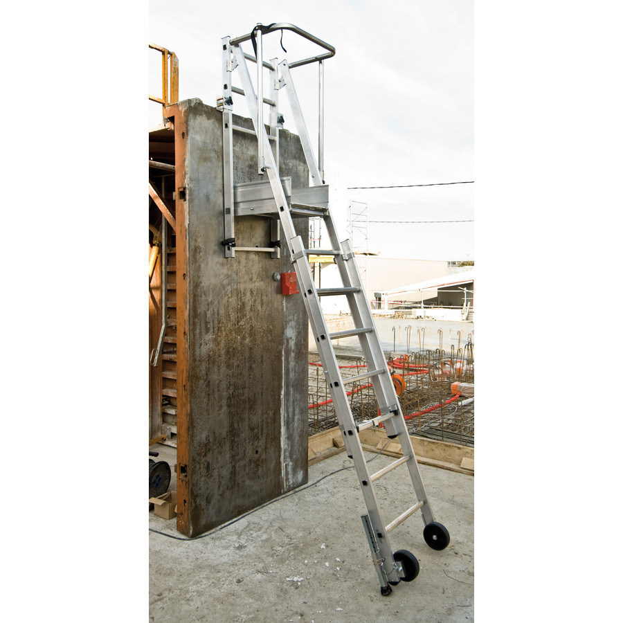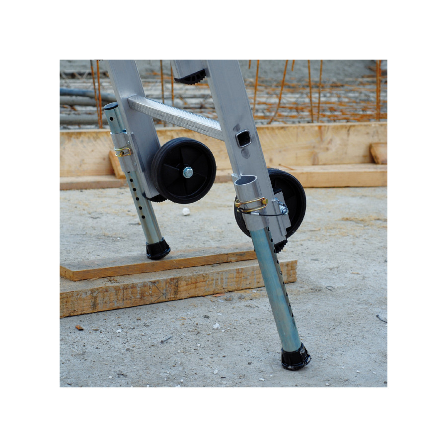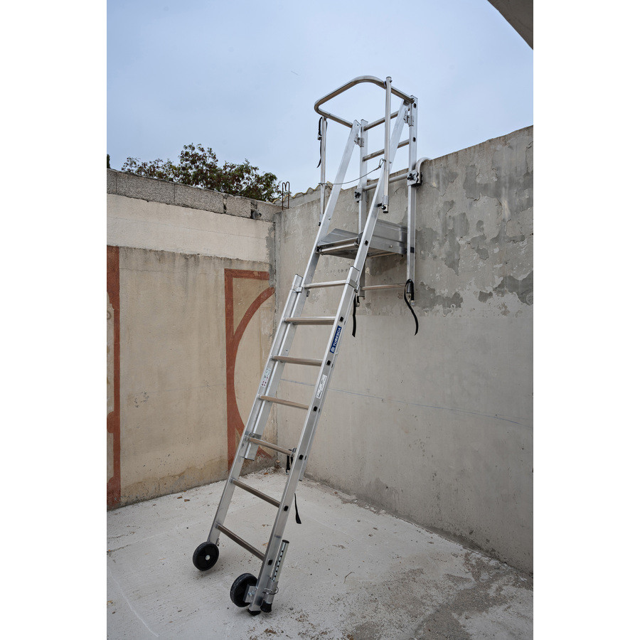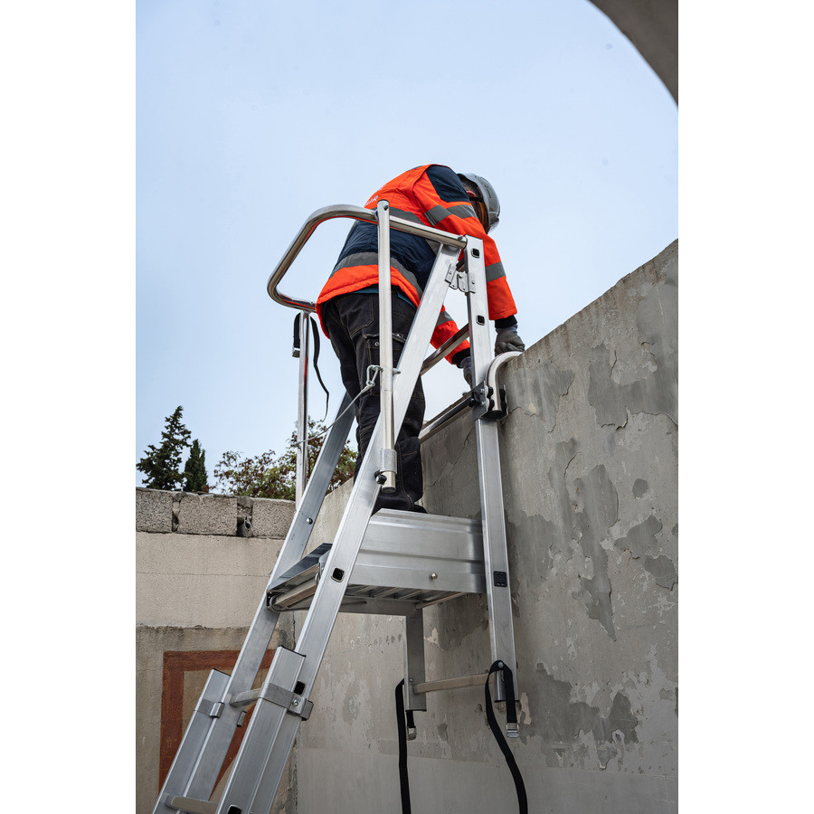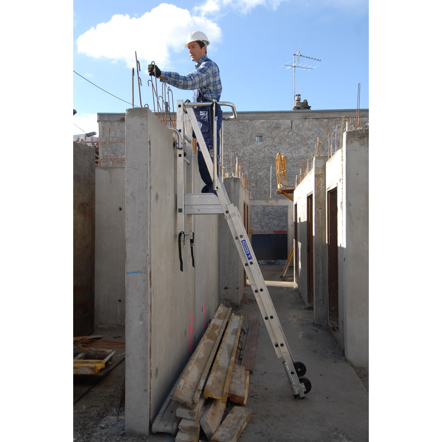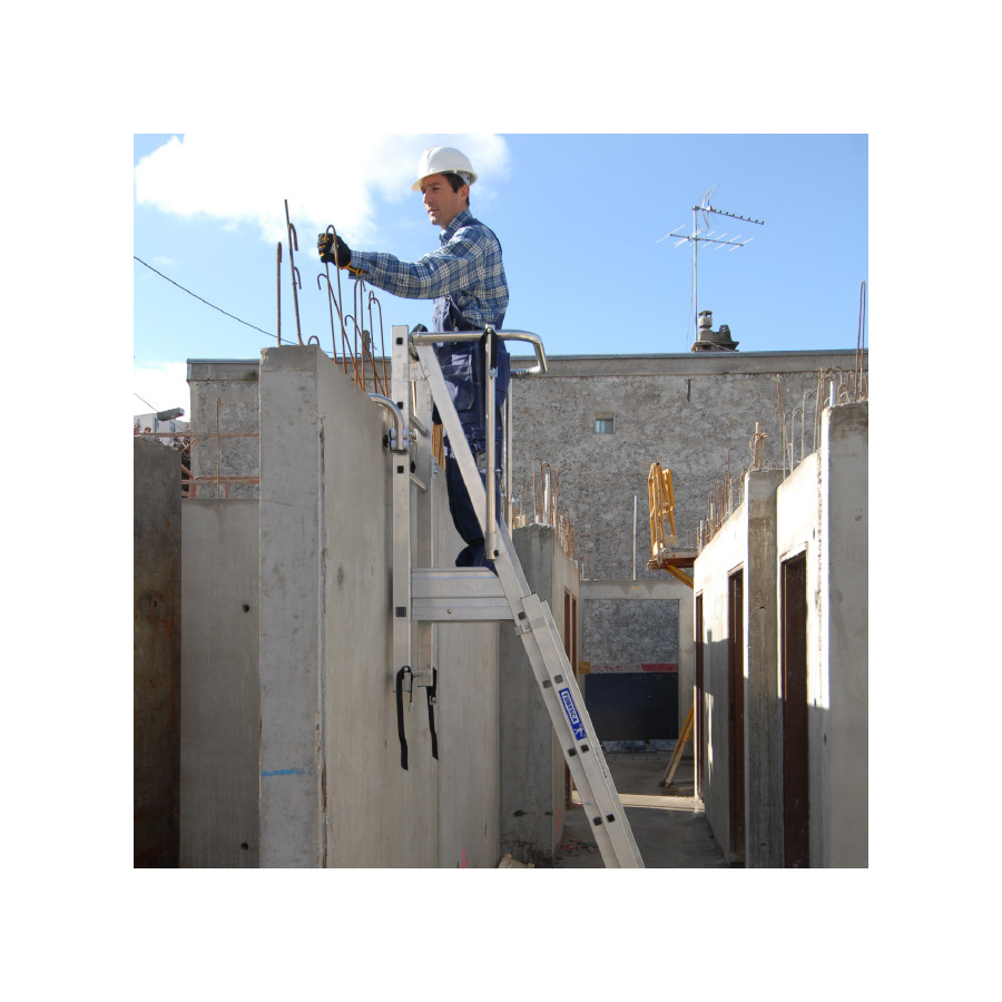 L'échelle télescopique Prémur Tubesca-Comabi entièrement en aluminium dispose d'un garde-corps et d'une plate-forme avec plinthes intégrées. Grâce à ses crochets de 384 mm, elle permet également un amarrage sur les murs ou banches lors de la construction. Ses pieds réglables permettent une ad-aptation sur tous les sols. Ce modèle respecte le décret 2004-924.