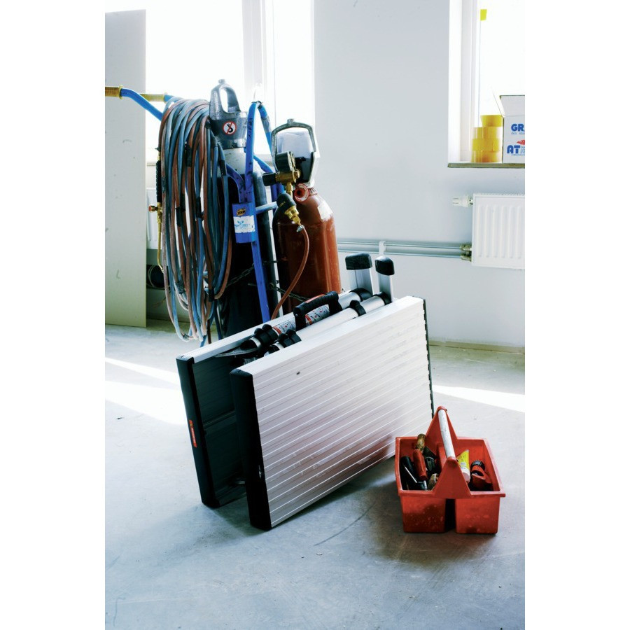 En position montée ou de transport, les éléments du montant s'enclenchent automatiquement.Facile à transporter grâce à la poignée creuse dans le revêtement de la plate-forme.Mise en place simple et ra...