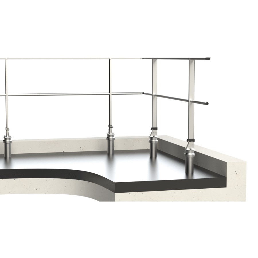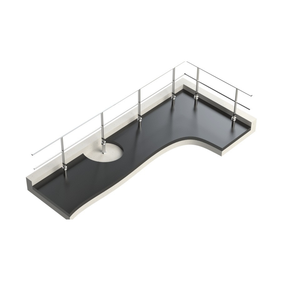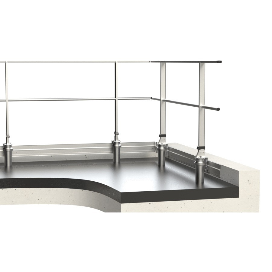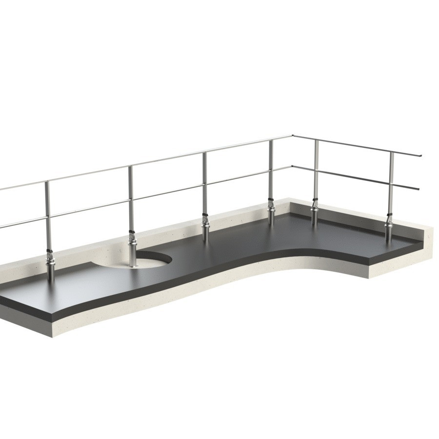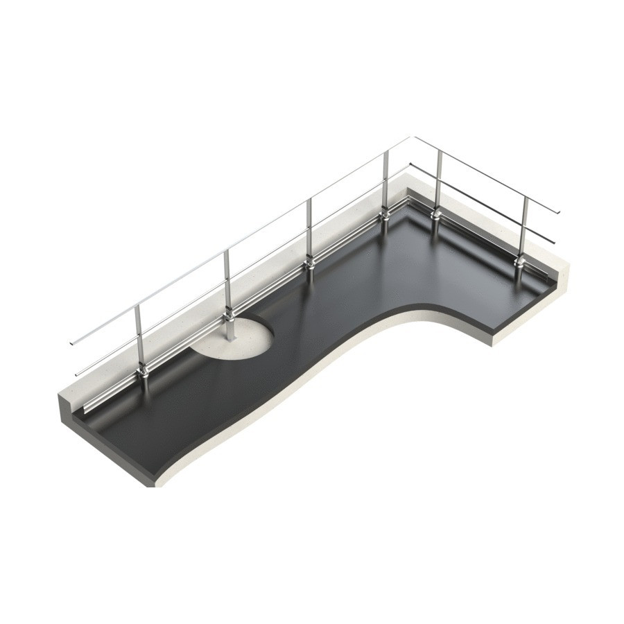 Le garde-corps sur dalle étanchée FASTGUARD se fixe sur dalle isolée à travers le complexe d'étanchéité par le biais de son embase sabot D.